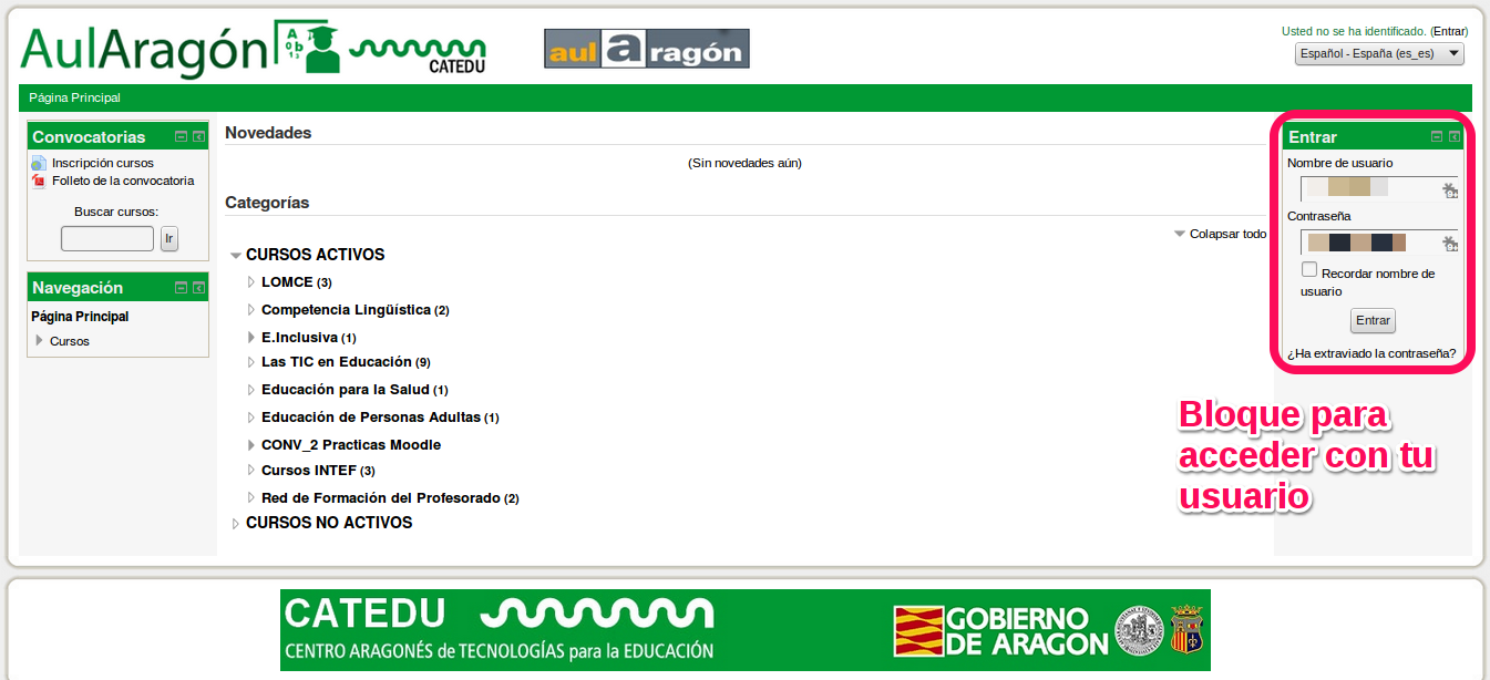 Si insertamos correctamente nuestro usuario y contraseña, sale arriba a la derecha Usted se ha identificado como ... y nos aparecerá una pantalla donde entraremos en Mis cursos.