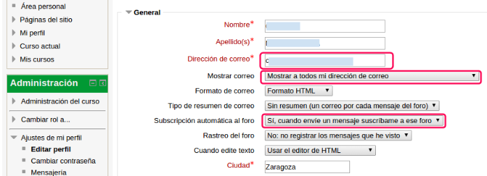 Desde Editar perfil, podemos decidir si nuestros alumnos** pueden ver nuestro email** (no recomendable, es preferible que toda comunicación se haga dentro de la plataforma), que llegue un** aviso a nuestro email** cuando alguien escribe en el foro (recomendable), etc..